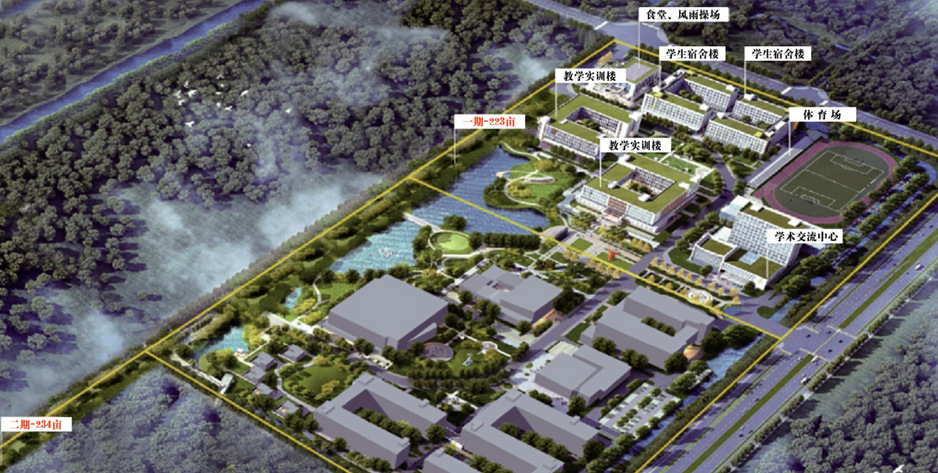 江苏建筑职业技术学院湖西校区位于徐州市沛县县城湖西职教园,距离主校区80km,车程约1小时。已划转产权面积456.58亩、建筑面积10.75万m2 。可容纳在校生规模约5000人,具有独立的办学空间和功能齐全的教学生活设施,符合高校校区办学条件。其中,一期占地223.14亩,已建成校舍建筑面积10.75万m2。包括教学实训楼42663.21m2、学术交流中心23568.01m2、风雨操场及体育看台2646.86m2,学生公寓34374.89 m2,学生食堂4252.86 m2。二期占地233.44亩为规划用地。学校根据总体办学规划,适时推进建设教学、实训、科创等多功能校舍建设。