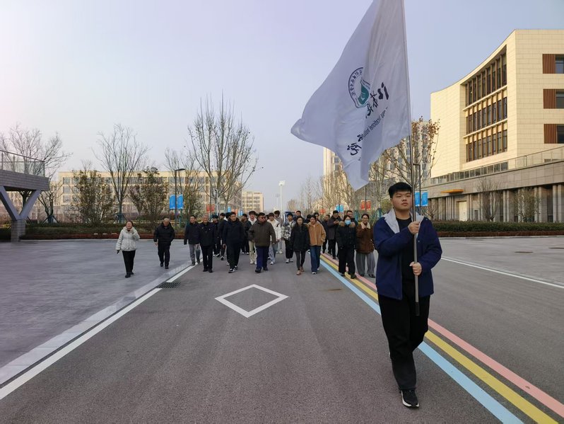 队伍从体育场看台前集结出发。在旗手的引领下,教师们精神抖擞,迈着矫健的步伐,沿预定路线前行。大家依次经过校区C1楼、东大门、图书馆、湖边、C3教学楼,最终全体返回体育场起点。一路欢声笑语,步伐坚定,展现了教职工们昂扬向上的精神风貌。